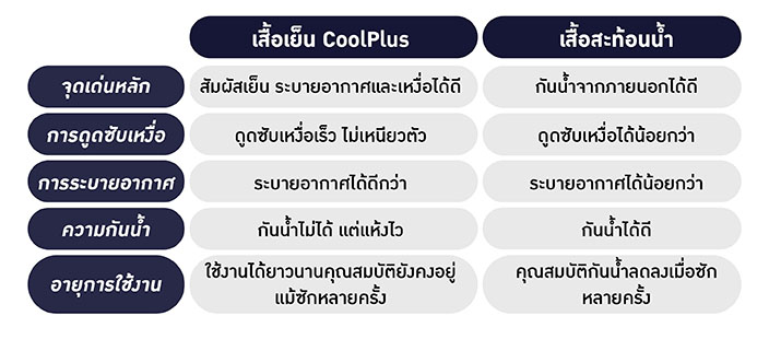 เมื่อเปรียบเทียบแบบเจาะลึกในประเด็นที่เกี่ยวกับความสบายโดยตรง จะเห็นความแตกต่างอย่างชัดเจนระหว่างเสื้อเย็น CoolPlus กับเสื้อสะท้อนน้ำ โดยจะขยายในแต่ละหัวข้อเพื่อให้มองเห็นภาพจริงในการใช้งาน