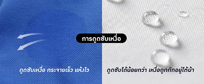 การดูดซับเหงื่อถือเป็นหัวใจสำคัญของเสื้อใส่สบาย เพราะพนักงานทุกคนมีเหงื่อไม่มากก็น้อย โดยเฉพาะในสภาพอากาศเมืองไทย เสื้อเย็น CoolPlus ถูกออกแบบมาให้ดูดซับเหงื่อและแห้งได้เร็วมาก จึงช่วยลดความเหนียวตัวได้เป็นอย่างดี ในขณะที่เสื้อสะท้อนน้ำเนื่องจากมีสารเคลือบกันน้ำ เหงื่อจึงไม่สามารถซึมออกจากผิวได้เร็วเท่า ทำให้เมื่อมีเหงื่อบนผิว อาจทำให้รู้สึกอึดอัดหรือเหนียวตัวได้ง่ายกว่า