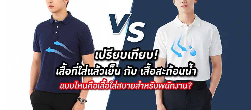 A: หากโจทย์หลักคือความสบาย ใส่แล้วไม่ร้อน ไม่อับ และเหมาะกับการทำงานทั้งวัน เสื้อเย็น CoolPlus จะตอบโจทย์มากกว่า ส่วนเสื้อสะท้อนน้ำเหมาะกับองค์กรที่ต้องการฟังก์ชันกันน้ำเป็นหลัก