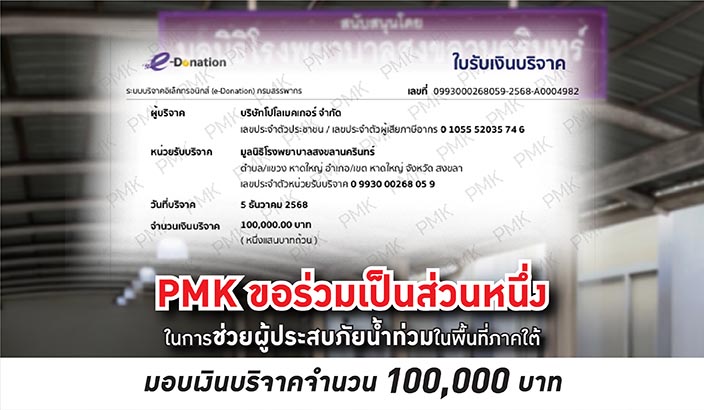หนึ่งในความตั้งใจของ PMK ในการช่วยน้ำท่วมครั้งนี้ คือการมอบเงินจำนวน 100,000 บาท ให้กับมูลนิธิโรงพยาบาลสงขลานครินทร์ เพื่อสนับสนุนการทำงานของทางมูลนิธิในการช่วยเหลือผู้ที่ได้รับผลกระทบจากสถานการณ์น้ำท่วม โดย PMK เชื่อว่ามูลนิธิซึ่งอยู่ใกล้ชิดกับชุมชนและรับรู้ปัญหาอย่างต่อเนื่องนั้น จะสามารถนำเงินจำนวนนี้ไปใช้ให้เกิดประโยชน์สูงสุดตามความจำเป็น ไม่ว่าจะเป็นการสนับสนุนด้านสุขภาพ การจัดหาอุปกรณ์ที่ต้องใช้ในช่วงเหตุฉุกเฉิน หรือการช่วยเหลือด้านอื่น ๆ ที่เหมาะสมกับสภาพของพื้นที่ในขณะนั้น ซึ่งทั้งหมดนี้ PMK ตั้งใจที่อยากมีส่วนร่วมในการช่วยน้ำท่วม ผ่านช่องทางที่เชื่อถือได้ และส่งต่อไปถึงประชาชนที่ต้องการความช่วยเหลือจริง ๆ ในช่วงเวลาที่สำคัญ