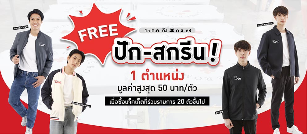 - สิทธิพิเศษ: สั่งซื้อเสื้อแจ็คเก็ต ฟรี!ค่าปักโลโก้ หรือ สกรีน 1 ตำแหน่ง มูลค่าสูงสุด 50 บาท/ตัว เมื่อสั่งเสื้อแจ็คเก็ตขั้นต่ำเพียง 20 ตัว เท่านั้น