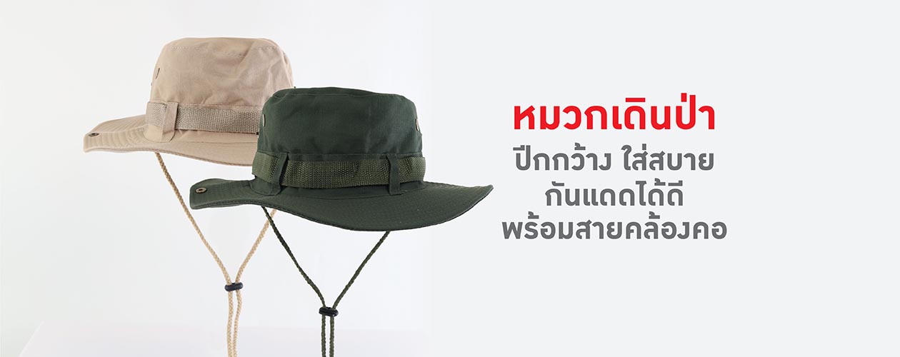 หมวกเดินป่า หรือ wide brim caps ทรงปีกกว้าง ที่ออกแบบมาเพื่อกิจกรรมกลางแจ้งโดยเฉพาะ ผลิตจากผ้าโพลีเอสเตอร์ (Polyester) ที่ทนทานต่อสภาพอากาศ ช่วยกันแดดได้รอบด้าน มาพร้อมสายคล้องคอและตัวล็อค