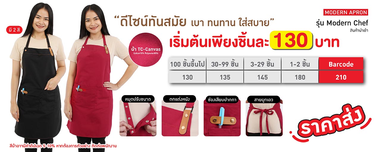 MODERN APRON Modern Chef เนื้อผ้า TC-Canvas Cotton 15% Polyester 85% “ดีไซน์ทันสมัย เบา ทนทาน ใส่สบาย” ฟังก์ชันเยอะ ราคาส่ง!