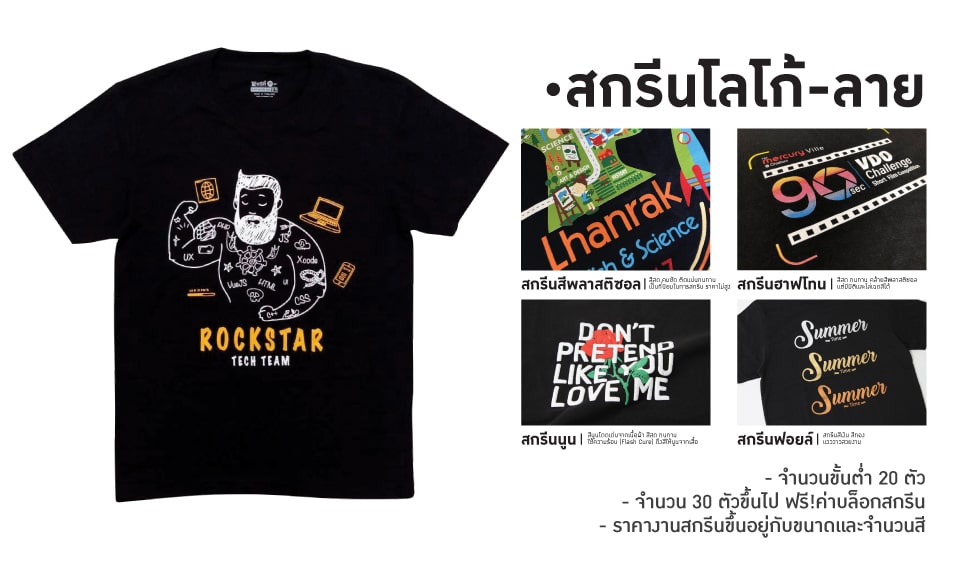 สามารถเลือกใช้เสื้อรีไซเคิล แล้วสั่งปัก-สกรีนโลโก้ได้ทันที มีหลายรุ่นให้เลือก ไม่ว่าเสื้อที่ทำจากขวดพลาสติก, เสื้อที่ทำเศษผ้าคอตตอนนุ่มใส่สบาย รองรับได้งานด่วน ไม่รอนาน