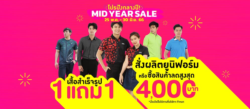 นอกจากนี้ขอชวนท่านมาร่วมสนุกและสัมผัสประสบการณ์ช้อปปิ้ง “MID YEAR SALE” ที่นำเสนอโปรโมชั่นที่คุ้มค่าและน่าสนใจ ไม่ว่าจะเป็นโปรโมชั่นซื้อ 1 แถม 1, 2 แถม 1, 3 แถม 1 เสื้อโปโล เสื้อกีฬา บางรายการ หรือโปรโมชั่นซื้อครบรับส่วนลดทันที ที่ตั้งต้นตั้งแต่ ซื้อครบ 5,000 บาท ลดทันที 400 บาท ถึง ซื้อครบ 30,000 บาท ลดทันที 4,000 บาท และกิจกรรมไลฟ์สด แจกเสื้อ ผ่านทาง Facebook