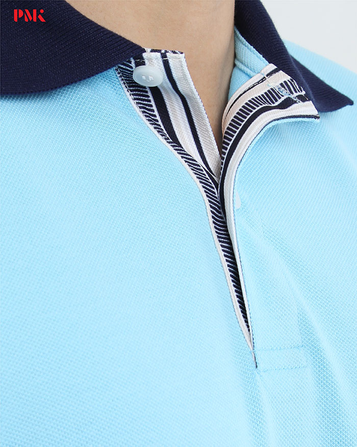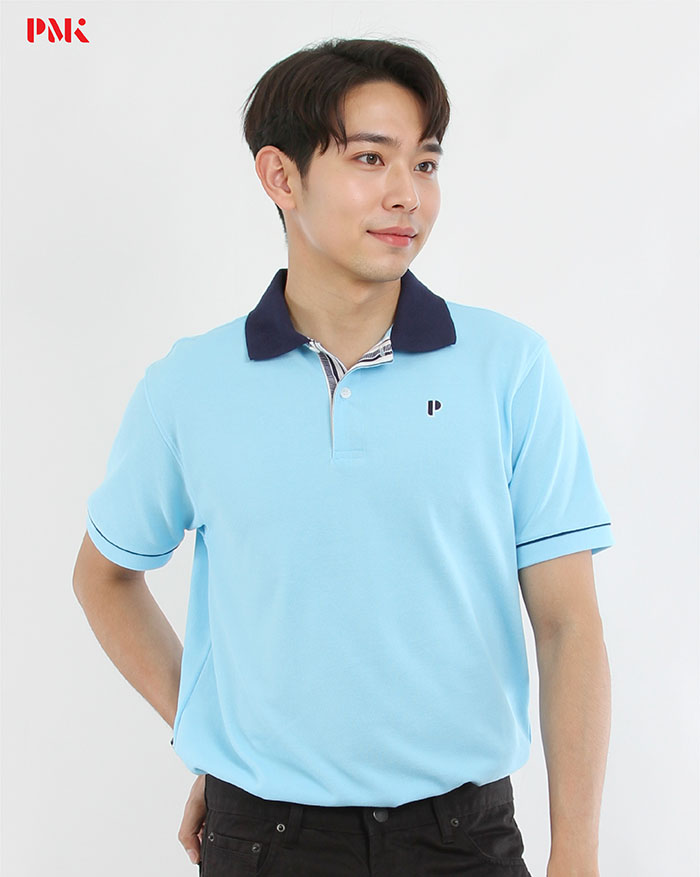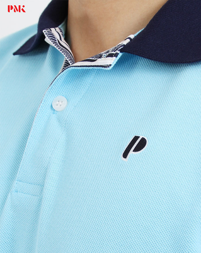 สาบเสื้อพิมพ์ลาย / ปักโลโก้ตัว P ที่อกซ้าย / กุ๊นแขนสีเดียวกับปก / ชายเสื้อผ่าข้าง